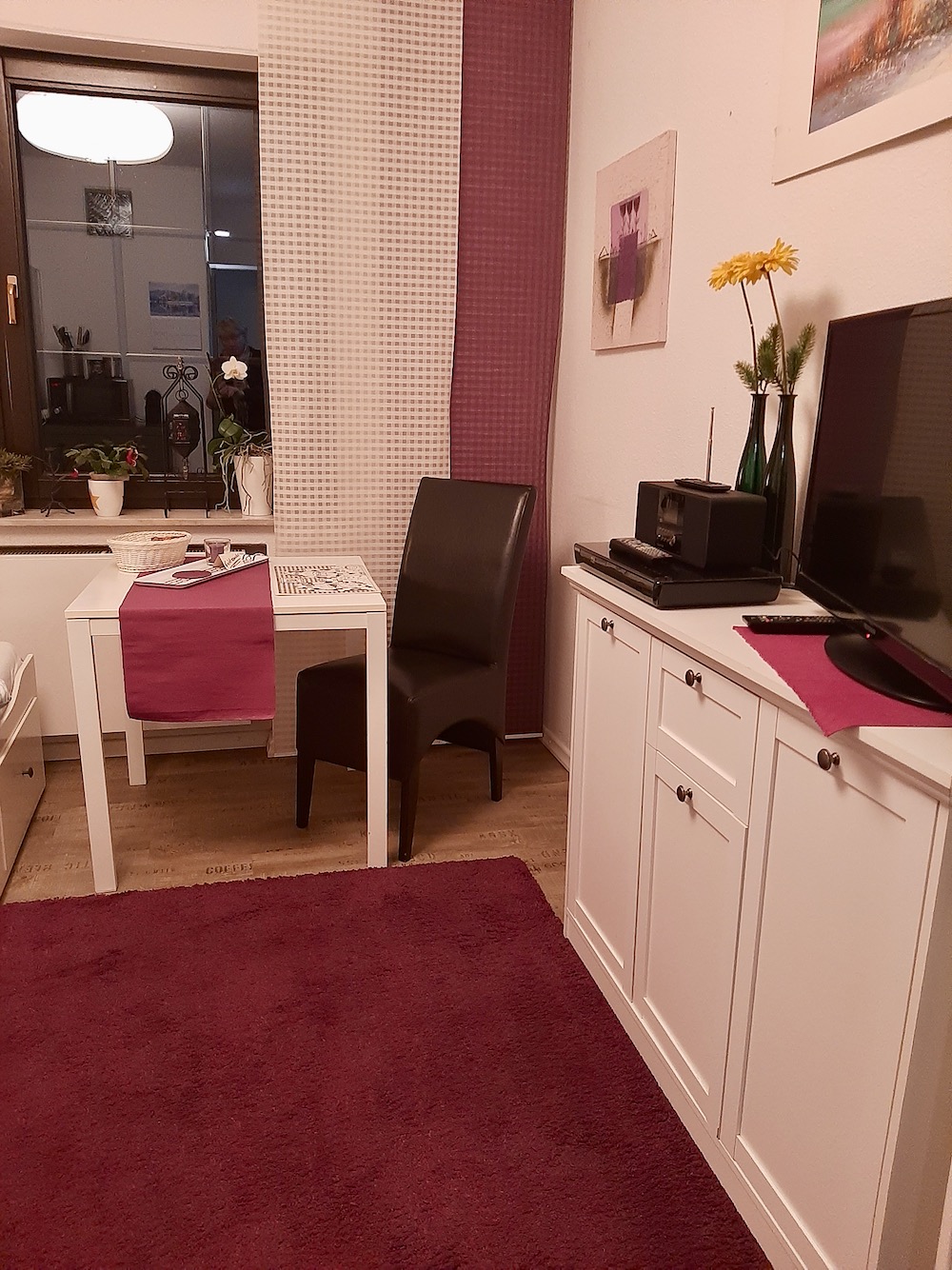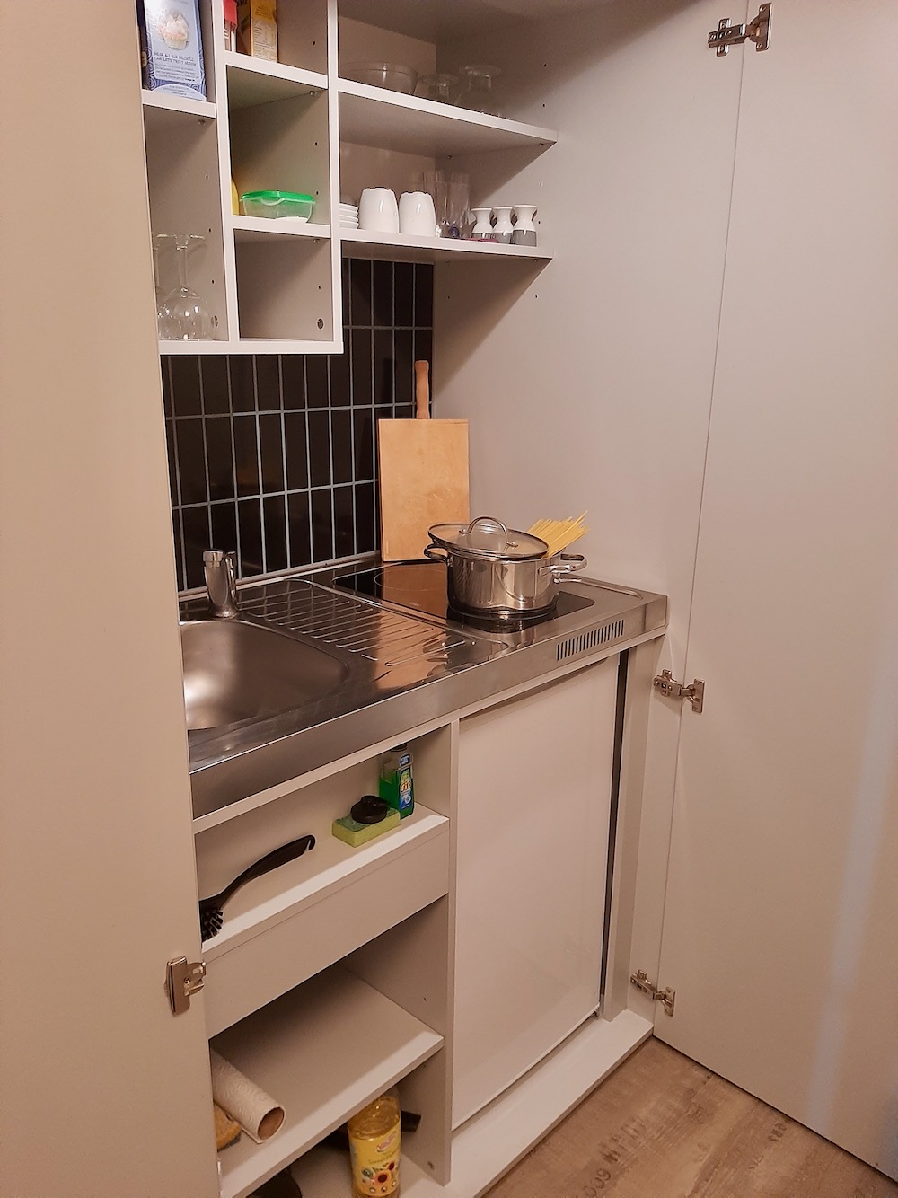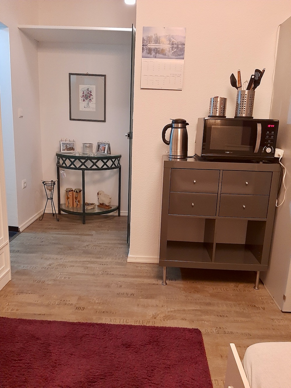 Unser Mini-Appartement für 1-2 Personen bietet jeden Komfort, und verfügt über ein modernes Bad mit ebenerdiger Dusche (Föhn vorhanden), sowie über eine kleine Küche mit Kühlschrank, 2-er Ceranfeld, kombiniertes Mikrowellen-/Heißluftgerät, Wasserkocher, Toaster und Kaffeemaschine.